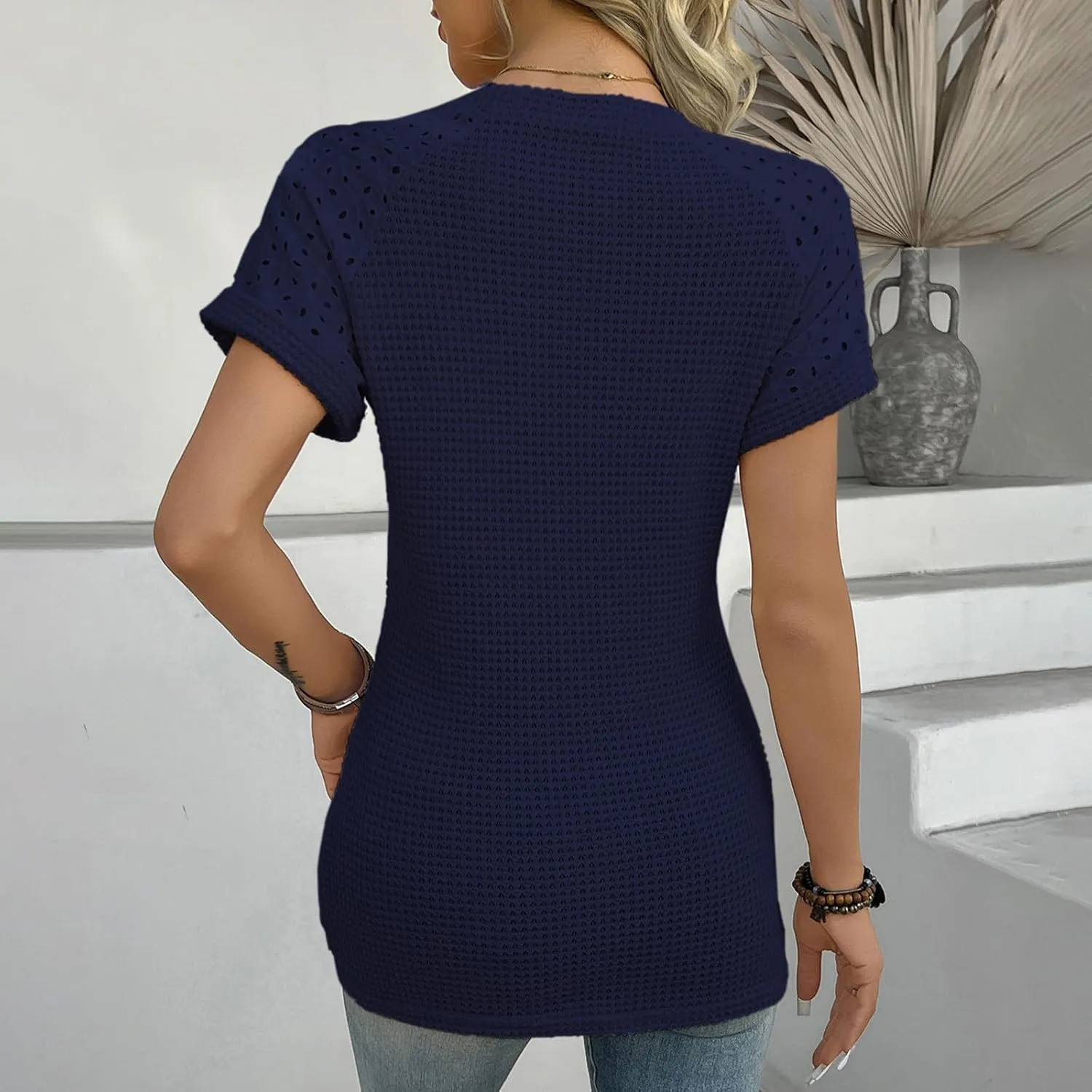 2025 Women Back Button Jacquard Short Sleeve Top Fashion Round Neck Clothes Casual Loose Blouse Tees Vacation T Shirt