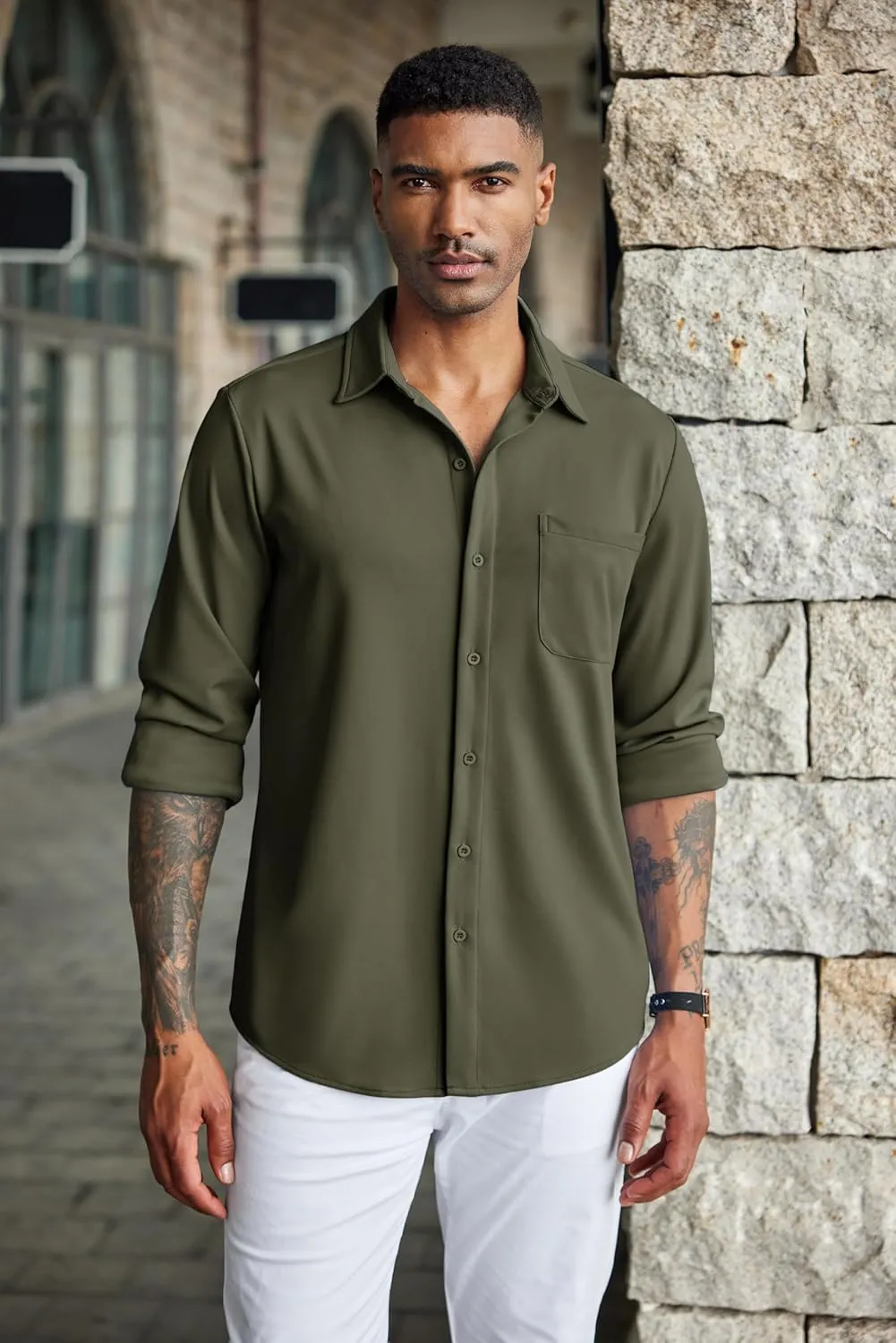- WRINKLE FREE DRESS SHIRT --- COOFANDY men's wrinkle free stretch long sleeve button down shirts are made from elastic, soft, lightweight, and breathable fabric. This kind of fabric will give silky and flowy wearing feeling and is wrinkle-free, moisture-wicking, and quick-dry.