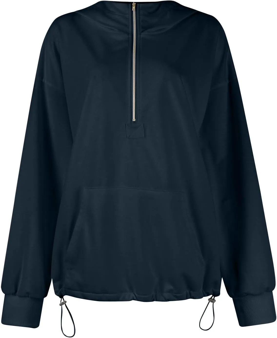 Half Zip Pullover Women Oversized Drawstring Hem Drop Shoulder Cropped Sweatshirt Loose Low Cut Long Sleeve Shirt