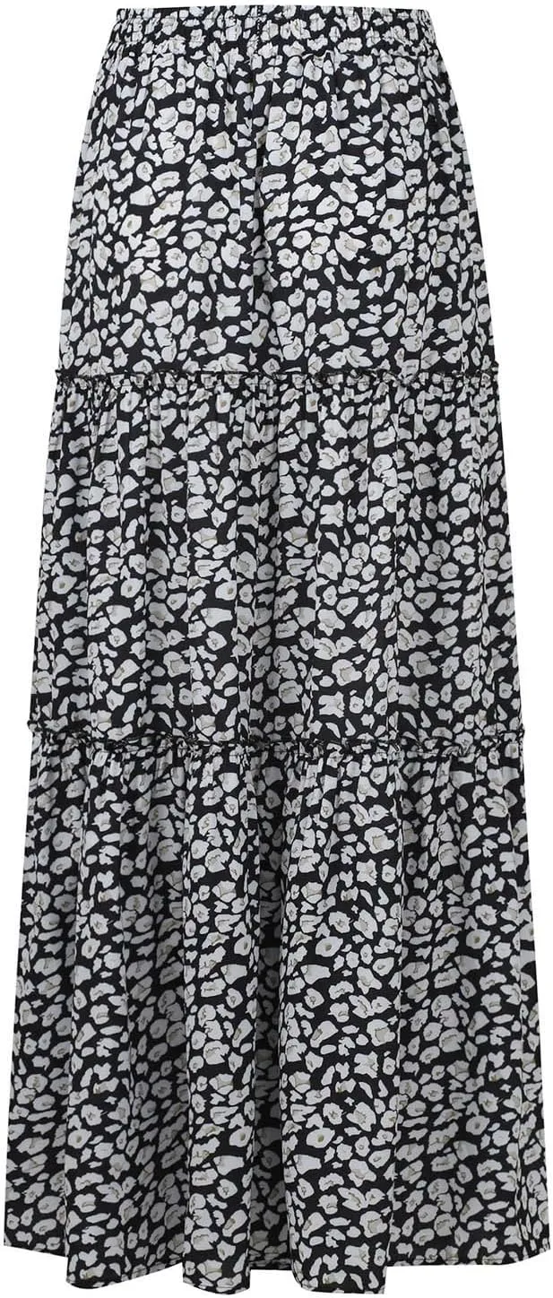 Maxi Pleated Skirts for Women Floral Print Boho Tiered Skirt Elastic High Waist A Line Flowy Long Skirts with Pocket