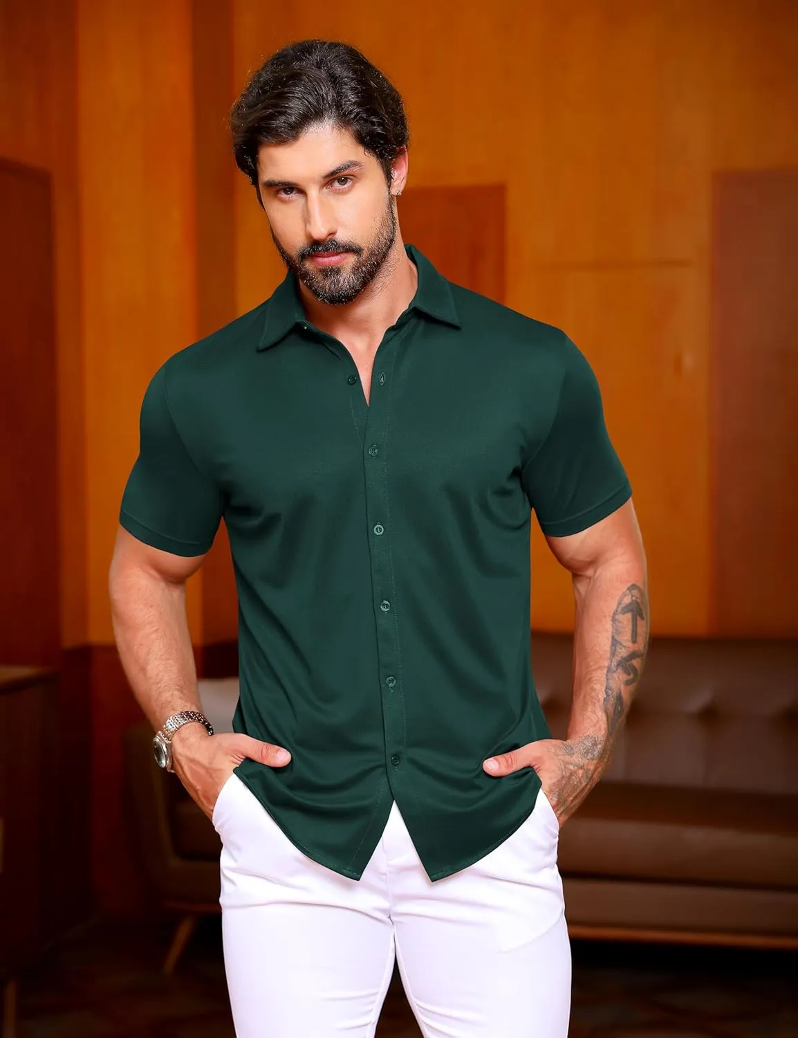 - VERSATILE SHIRTS STYLE. - The mens stretch short sleeve shirts come with a variety of different color styles, don't hesitate to get your favorite one, to match with your formal trousers for dressy need, with casual long pants for a night out, or create with casual shorts for summer beach.