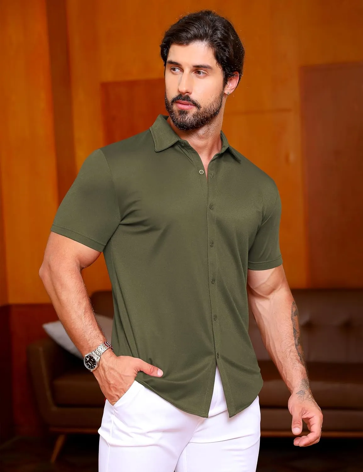 - VERSATILE SHIRTS STYLE. - The mens stretch short sleeve shirts come with a variety of different color styles, don't hesitate to get your favorite one, to match with your formal trousers for dressy need, with casual long pants for a night out, or create with casual shorts for summer beach.