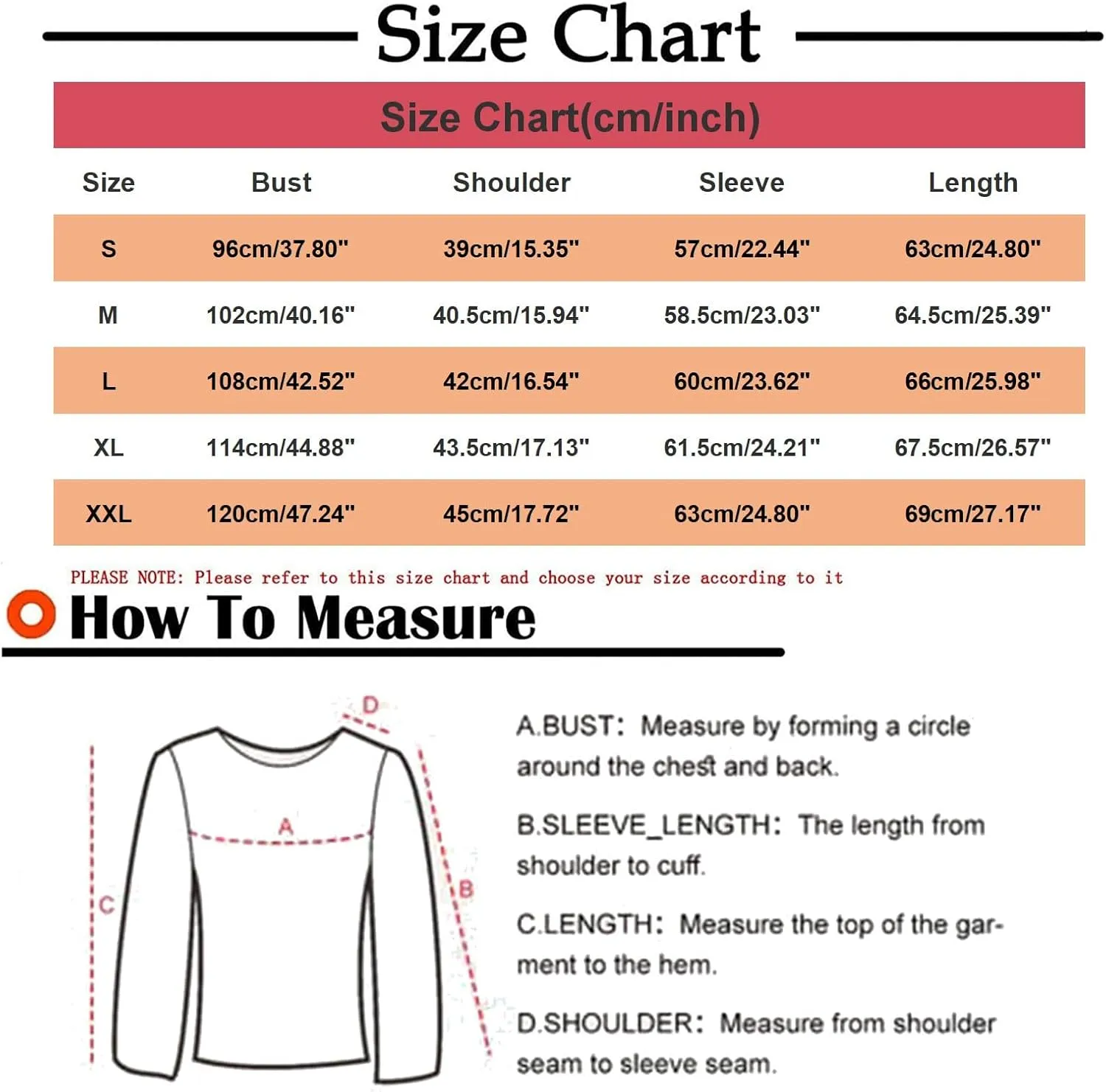 Please allow 0.5-1.0 inches measuring deviation due to manual measurement and different stretch of fabrics.